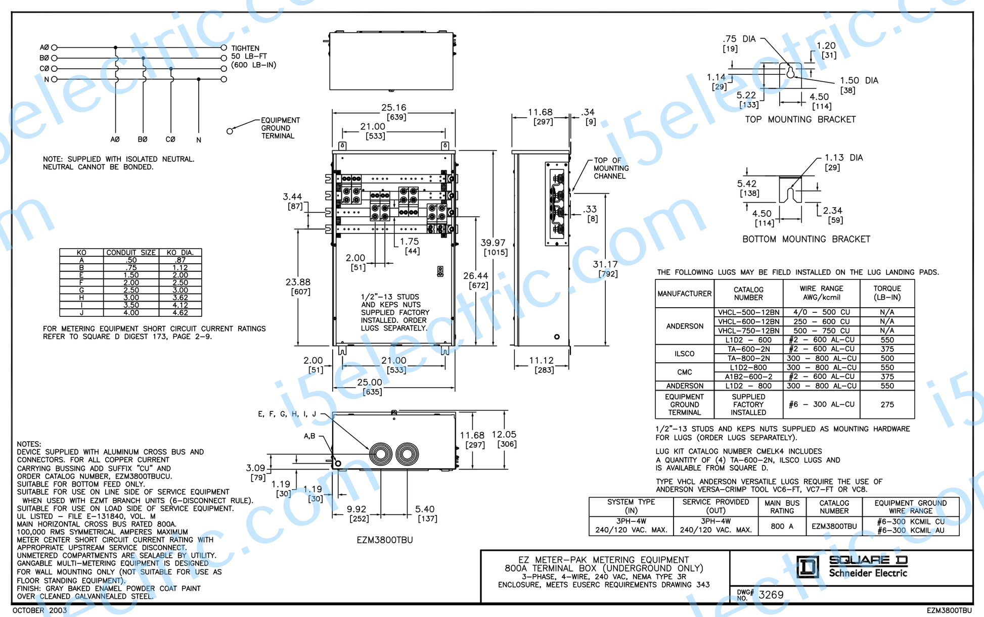 SQUARE D SCHNEIDER EZM3800TBU 800 AMP 3PH EZM METER MAIN LUGS TERMINAL BOX TAPBOX EUSERC